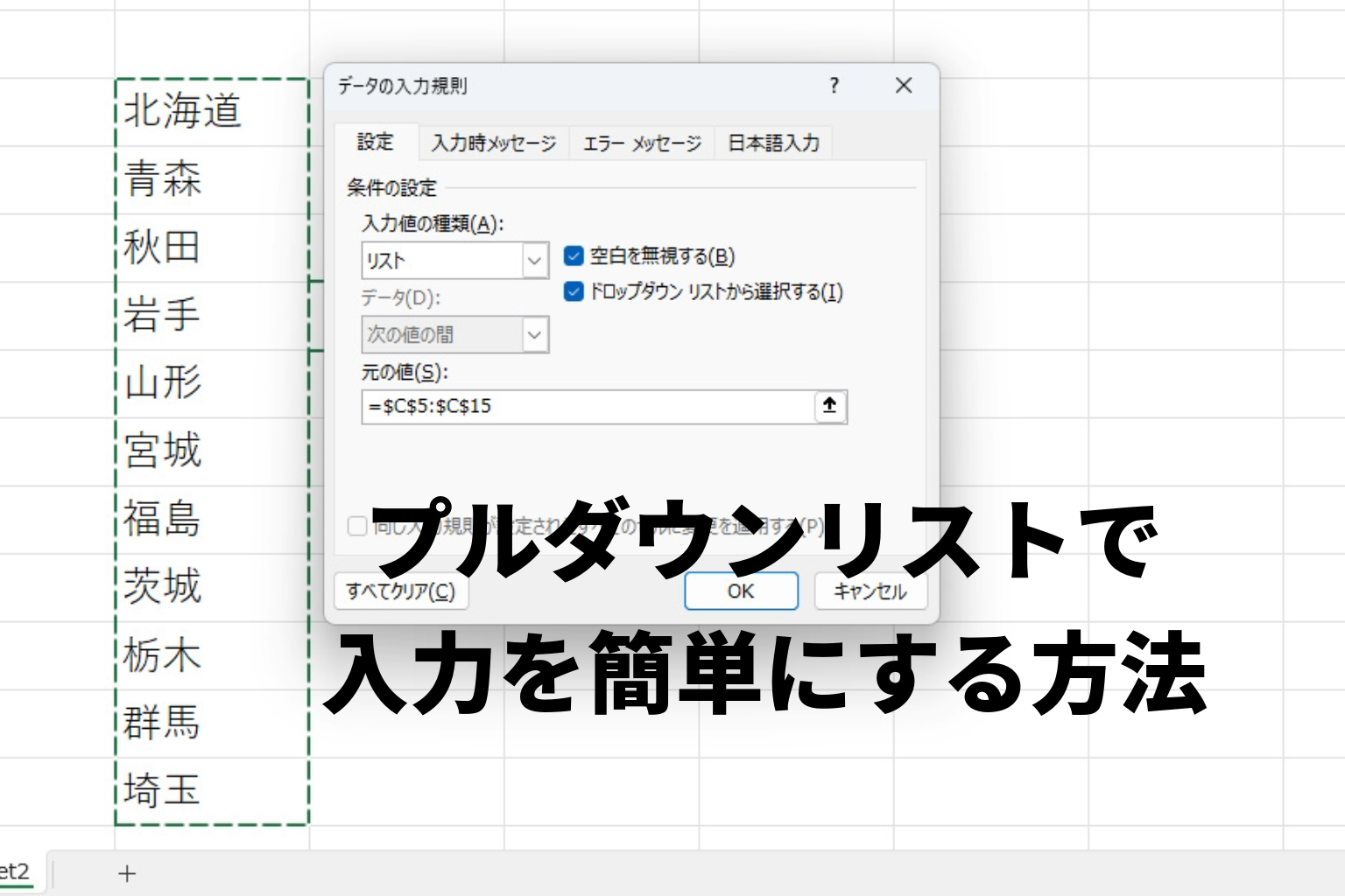 • 親リストの内容(例:都道府県)を名前付き範囲として定義
